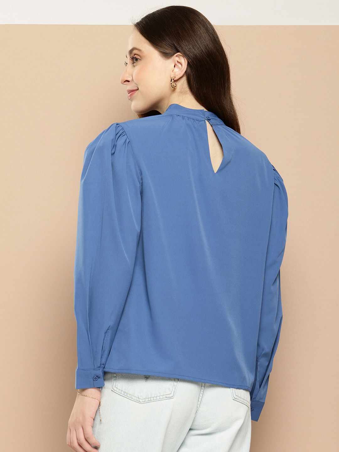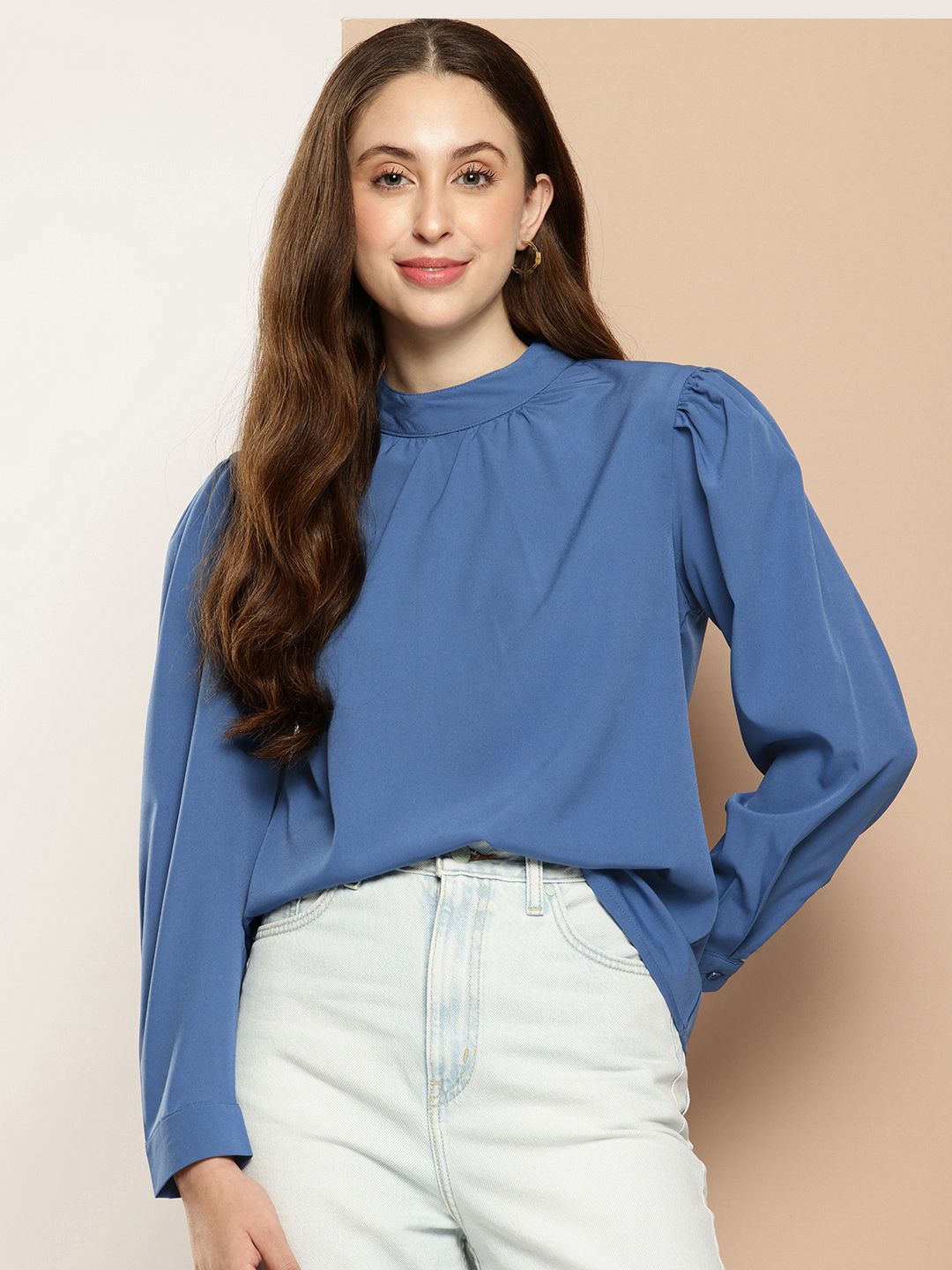 Elevate your wardrobe with this versatile and elegant high-neck top. Crafted in a rich blue hue, it features long cuffed sleeves and a flattering silhouette that seamlessly transitions from desk to dinner.